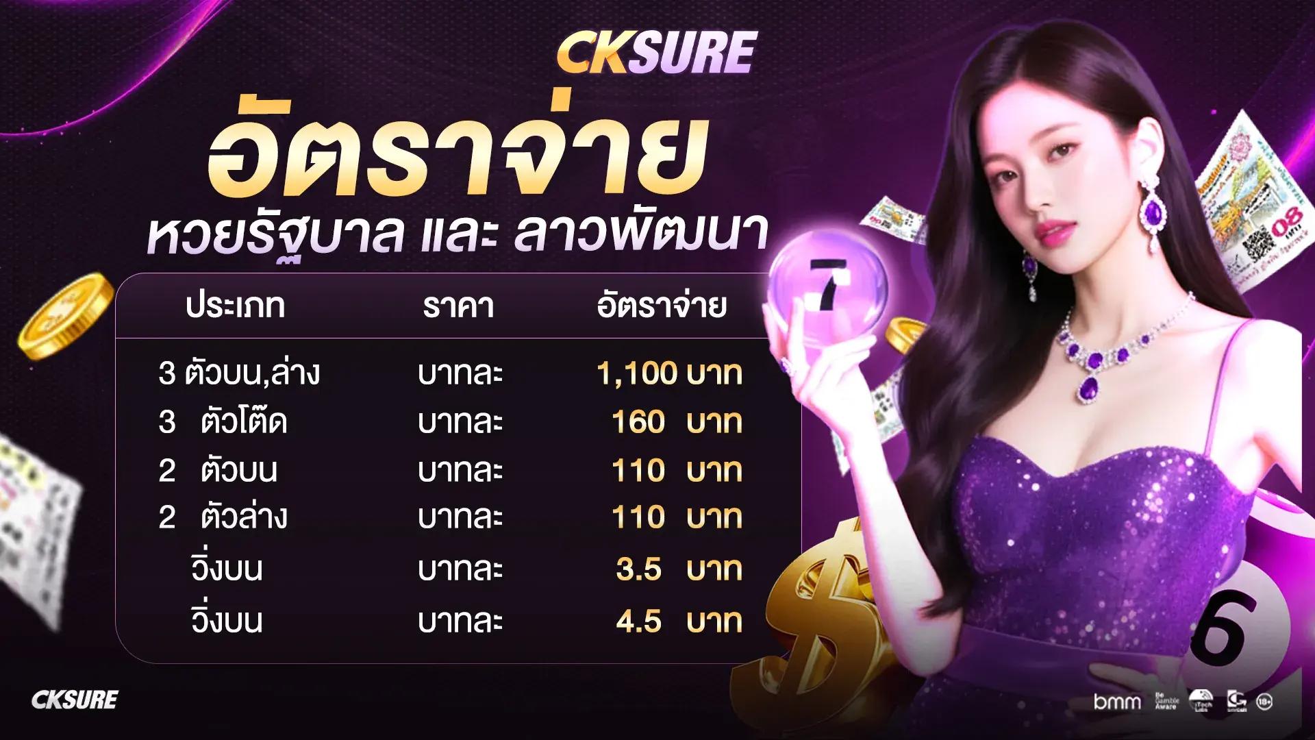 สำหรับคอหวยห้ามพลาด! เพราะ cksure มีบริการแทงหวยครบทุกประเภท ทั้งหวยรัฐบาลไทย หวยลาว หวยฮานอย และหวยยี่กีที่ออกรางวัลทุก ๆ 15 นาที โดยให้อัตราจ่ายสูงถึงบาทละ 900 พร้อมระบบฝาก-ถอนอัตโนมัติที่รวดเร็วทันใจ