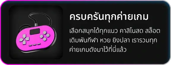 ตอบ : มีคาสิโนสด สล็อต กีฬา เกมโต๊ะ หวย ครบวงจร รวมถึงเกมยอดนิยมจากค่ายดัง เช่น SA Gaming, Pragmatic Play และ Evolution Gaming